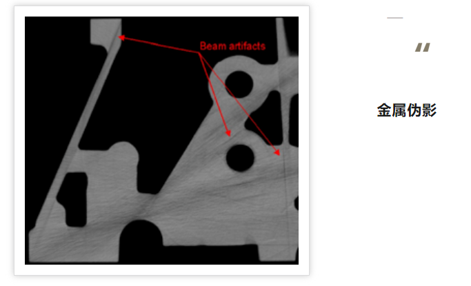 对于密度差异较大的扫描对象,高密度物体之间会产生带状伪影,图像中表现为从金属区域发出的条纹、金属周围的亮或暗伪影以及各种噪声等,放射状伪影是金属衰减系数与周围物质衰减系数差异过大引起的。