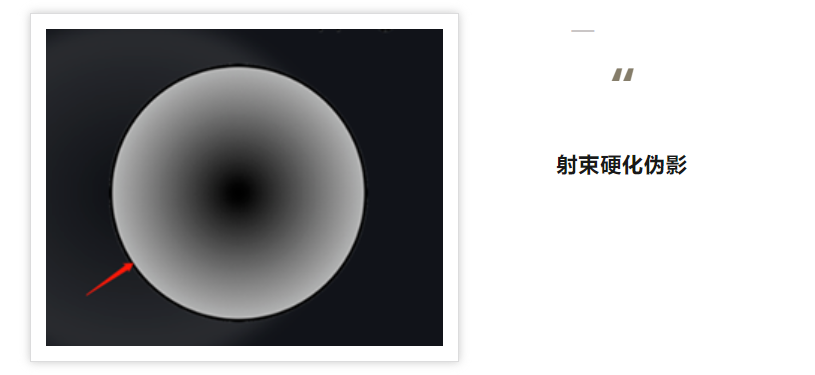 CT系统中射线源的多能特性,随着入射深度的增加,低能光子衰减程度大于高能光子,射线的平均能量逐渐增高,X射线逐渐“变硬”。而CT重建算法都是在射线为单能的理想前提下进行的,这就导致重建的结果存在误差,由这种误差导致的伪影就是硬化伪影。对于均匀材质的扫描对象,最典型的特征是杯状伪影,即均匀物质中间黑、边缘亮。